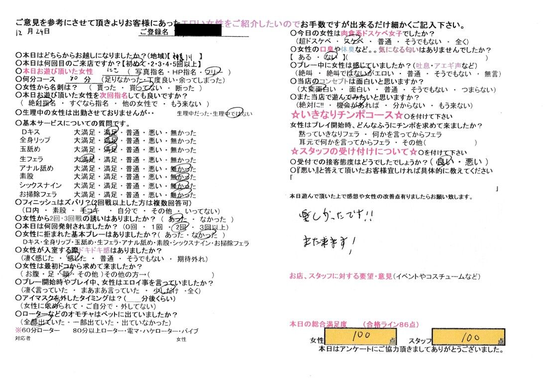 黒髪がよく似合う、清楚で落ち着いた雰囲気の「にこ」さん♪色白で小柄な彼女は調理師免許を持つ元キッチンスタッフという一面もあり、料理の腕前とエッチな事はお墨付き!!本人曰く、調理系の職業の方は性欲強いらしいです(笑)Dカップのハリのあるパイオツで、形がとにかく綺麗!!優しく乳首を責められると身体がビクビク反応してしまうほどの敏感体質!ずっとディープキスをしながら触られるのがとんでもなく好きなようで何度も求めてくる!!しかも濡れやすいなんて反則でしょ( *´艸`)性欲が強く基本ムラムラしてるとのことですが、「プライベートでオナニーはしません!!お兄さんと遊んでる時にイカセてもらうのが一番気持ちいいんです(n*´ω`*n)」と面接時に言われ、ちょっとビックリしましたが、にこさんの瞳に一点の曇りもありませんでした(笑)丁寧な物腰と礼儀正しさが印象的で、初対面でも安心感を与えてくれる!そんなタイプの女性です♪是非ご予約お待ちしております!!